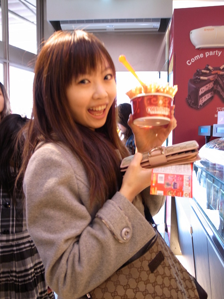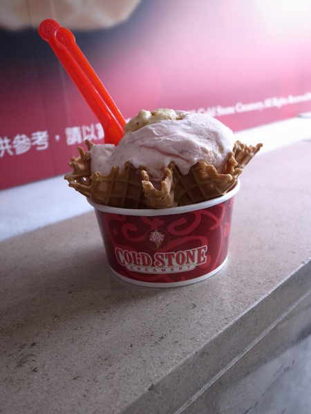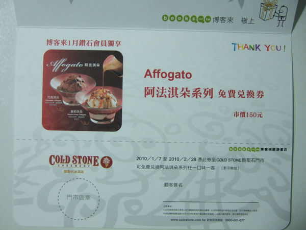 又,我把我從博客來得到的Coldstone免費兌換券(誰叫我是鑽石會員?!一整個很驕傲)給J,讓他現場兌換巧克力阿法淇朵。據他說,那球巧克力阿法淇朵的巧克力味不重,且相當甜膩,幾乎是一口斃命那樣。他個人覺得Haagen Dazs> Movenpick>Coldstone。