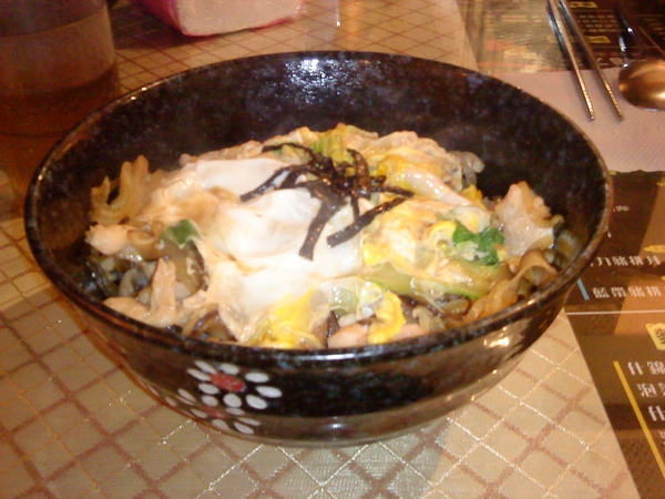 我點的是親子丼(90元),主餐之外,還附上一碗湯,另備有冷飲自取。親子丼醬汁吃來甜甜的,但也和多數丼飯一樣,初嚐時覺得味道很夠,但是吃多了會膩,可能是調味太飽了。反觀我自己做的東西也有個問題,總之擔心味道太飽滿對身體負擔太大,也容易膩,所以下手又太輕,想想要做到能兼具口味和健康的料理真不是件簡單的事。
