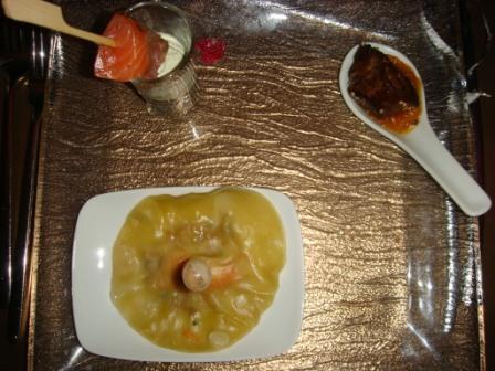 我們九點半到,被安排在一個擠著二十個人的房間裡。環顧四周,多是一臉無趣的情侶。坐下來看了菜單後,嚇了一跳。一共八道菜:從魚子醬、餓肝醬、干貝,應有盡有。(實際菜色與網路上公佈的菜單不同)