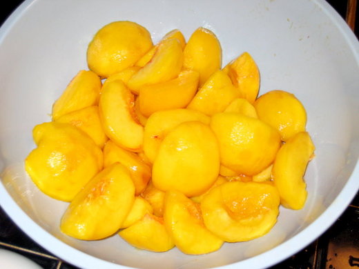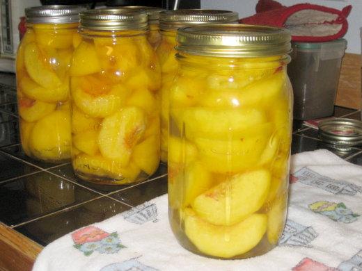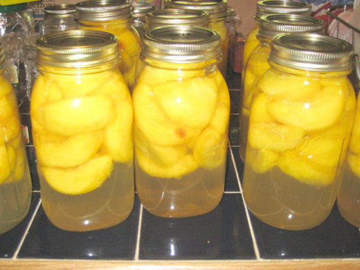 把煮開的糖水倒進裝滿水蜜桃的玻璃罐