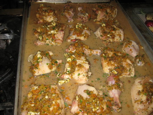 烤前把杏桃乾, 黃金葡萄乾切碎鋪在雞肉上,