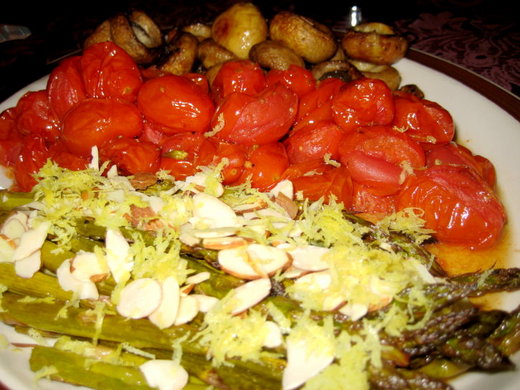 洋菇(去除stem)+蘆筍(用折斷的方式把老的部份丟掉)+小蕃茄