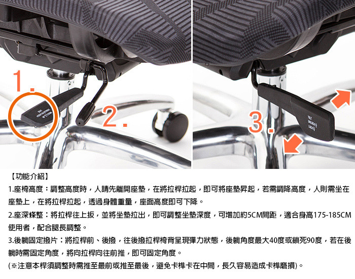 7.使用座椅前,需注意使否有安裝、鎖定穩固,請勿站在椅子上、跳座上椅子、蹬腳、雙腳離地、盤腿在座椅上,不當使用容易發生危險。