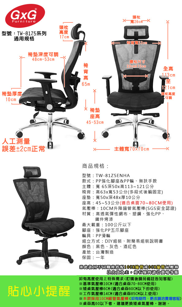 8.座面高度決定於氣壓棒使用長短,請選擇適當高度,若需求較高高度,建議加長氣壓棒尺寸,避免高度不夠,將氣壓棒升到最高,容易造成氣壓棒損壞。