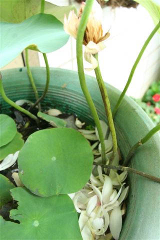 夜裡返舍,階前的荷花,竟然粉瓣全落,只剩不及長成的荷耦;花瓣