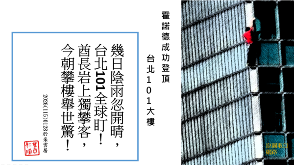 世界攀岩大師美國的艾力克斯霍諾德(Alex Honnold)在一月25日早上以無繩獨攀樓高508公尺的台北101大樓成功登頂,引來海內外無數的人屏息觀看的眼神。