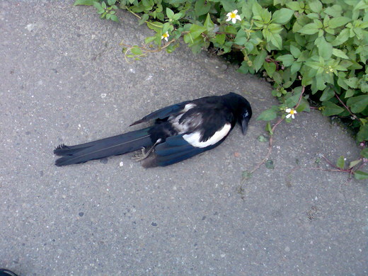 【註】前些日子,我下班時,途經大園埔心村田間小路,發現兩隻喜鵲,一隻橫在地上,一隻來回低飛。見我騎車過來,馬上飛起竄入林中。我停車看在地上的喜鵲,已經沒有氣息,但體溫還是溫的,應該是剛剛被車撞上了!我拾起來後幫牠按摩,但任我怎麼按摩還是無效!於是,我把牠放在路沿的低窪處,希望牠在醒來前不被打擾。但是過了些天,我再經過看看時,牠已經生蛆了。 2010/04/26再過此處,引發寫一首「路遇喜鵲」的想法,當晚回家後就寫好了。記得從去年看到喜鵲後直到現在都是雙雙對對唱鳴,所以我相信牠們是夫妻鳥,但在這個車禍事件後,我再也聽不到喜鵲的叫聲,更看不到喜鵲的身影,連南洋杉上的大鳥巢也沒有喜鵲身影,不知另一隻喜鵲到哪兒去了?但喜鵲來回低飛的影像到現在還是歷歷在目,我深受感動!因為鳥雖無語,鳥卻有情,人雖有語,人常無情!唉!