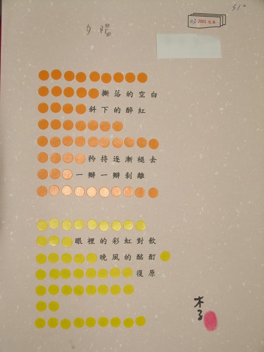 在解建創作設計體驗的十位參與者中僅S04創作八篇解建文本,其餘都創作九篇解建文本,合計共有八十九篇文本。參與者解建創作文本完成原樣(如上下圖),全部參與者解建文本的層次與原始文本的關係(從略)。