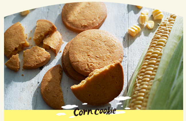 為了更顯出玉米的甘甜,使用北海道產的玉米粉製作。此外,餅乾中還有加入玉米片,經過烘烤過後,酥脆的口感一吃便會深深愛上它。玉米的原味香甜與獨特口感是此產品最大的魅力。