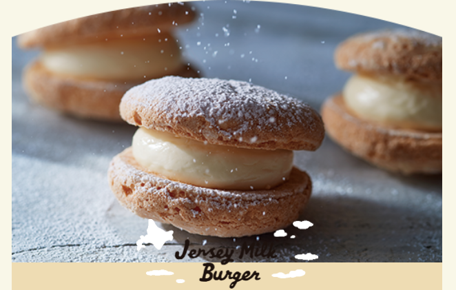 在鮮奶油漢堡中滿滿的澤西牛奶醬,是用北海道十勝產澤西牛奶所製。使用製程費工的濃郁澤西牛奶醬,加入奶油攪拌後,夾入剛出爐的鬆軟布雪蛋糕中製成的澤西牛奶漢堡,一口咬下,牛奶的柔順香甜滿溢口中。