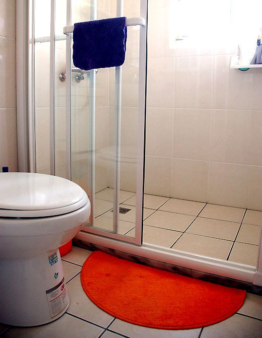 (下圖一:乾溼分離的浴室,掛在門把上的毛巾擦拭水漬;橘色半圓形腳踏墊非常便宜,29元,寶雅買的)