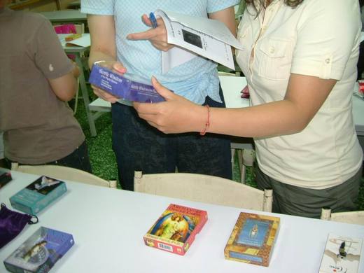 週五塔羅夜,帶了四處搜羅來的十幾副占卜牌卡,像獻寶似地,搬到班上給眾家同學開開眼界,總共十四副牌卡,有偉特和托特塔羅、有奧修禪卡和占卜卡、天使卡、神諭卡、獨角獸卡,還有易經占卜卡。每一副都有精緻設計與印刷,即使不拿來占卜,單是視覺的觀賞價值,就超精采的。