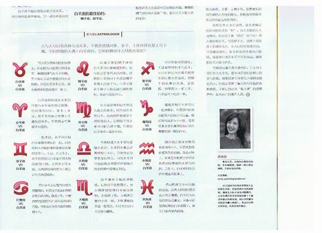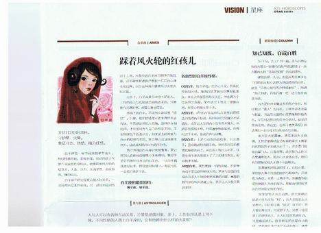 本來預計三月下旬出爐的專欄,因為菁英畫報改版忙亂和他們主編的思考角度(男性主編不喜歡放大家都弄的星座運勢),出版前臨時抽稿,編輯也沒適時通知我,害我到了出版後才知道,他們為了平息作者的怒氣(真的頗生氣的,在台灣就不會有那麼不尊重作者的情形發生),還特別請我去畫報社和那位主編溝通了一番,決定調整方向後,放在清明過後正式推出,然後又請我去吃了一頓超級好吃的上海菜,就~把我擺平啦!