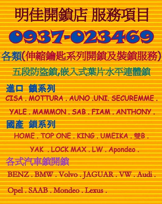 大台北縣市24小時開鎖店.裝鎖24小時開鎖匠服務專線:0937-023469明佳鎖店及分店為您服務天母士林區.北投區.關渡,淡水竹圍.大直內湖區.中山區.大同區.中正區.松山區.信義區.大安區.文山區.南港.汐止.社子.三重.蘆洲.開鎖24小時全年無休.24小時開鎖匠:提醒您,記得出示相關證明喔!!