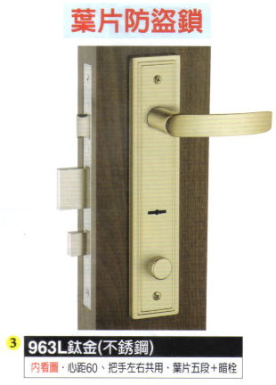葉片防盜門鎖此種鎖具是同金庫用片狀式排片疊堆原理組成鎖心,而延伸出無鎖心鎖具,簡單來說它是無鎖心的門鎖。