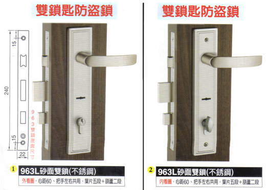 雙鎖心型式連體水平鎖,是近些年來較高級的鎖類,屬於較安全不會自動反鎖的鎖,並衍生出不同規格,算是非常多樣化的鎖類。各式鎖具規格的區分;則以葫蘆鎖心和把手位置在上中下分別型號而不同。