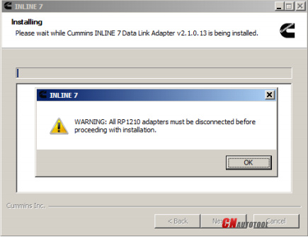 5. Carefully read the warning message, and disconnect all RP1210 adapters to which your laptop or PC might be connected prior to proceeding with the installation.