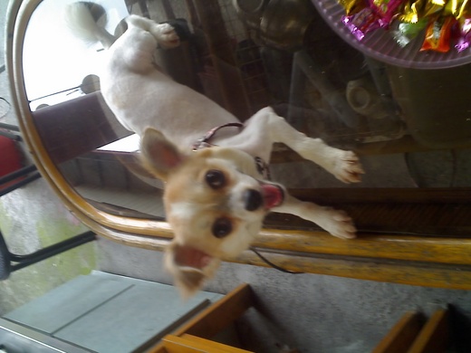 昨天從台北帶回來,第一件事就是帶牠到寵物店洗澡、剃毛,因為牠是長毛狗,我覺得牠可能會很熱,所以就先將牠毛毛剃掉了,希望琇琇(饅頭原來的主人)不要介意哦!