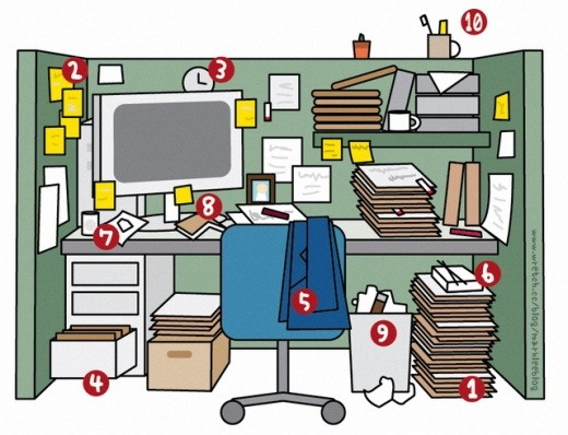 為什麼?因為沒有一個忙碌的人會有時間整理自己身邊的環境,老闆一點兒也不會希望看到你乾淨整齊的辦公隔間,這只能證明你時間真多,居然可以把自己的座位弄得和IKEA的辦公傢具展示區一樣。所以你以為美好的生活習慣可以贏得大家的掌聲?錯!請看下面的說明: