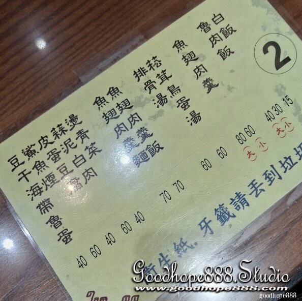 滷肉飯.魚翅肉羹.排骨湯.菘茸鳥蛋湯.魚翅肉羹飯.魚翅肉羹麵.蒜泥白肉.皮蛋豆腐.豆干.海帶.燙青菜.滷蛋.