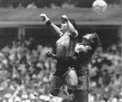 英格蘭門將希爾頓雖已盯住來球卡好位,躍起接應的馬拉度納卻高舉手臂,順勢揮出「上帝之手」 〈美聯社照片〉