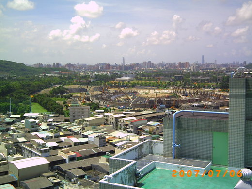 下圖1,兩年前高雄世運會場施工中的雛型,背景遠方突出的高樓,中為長谷大樓,右為85大樓。(長虹攝)