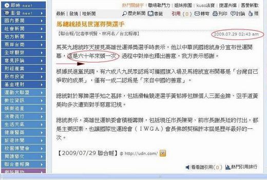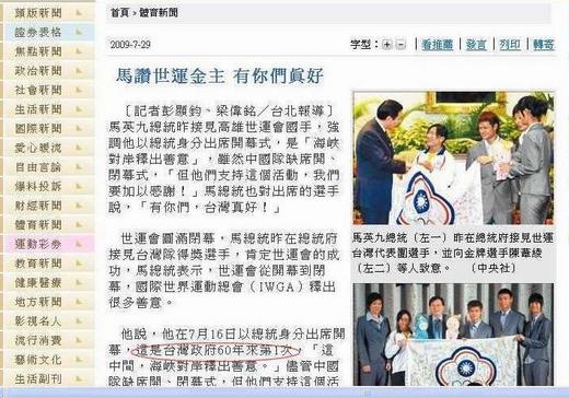 29日早上近十一點看到UDN一則新聞:馬總統接見世運得獎選手 ,(非如上圖),請注意,我是說「非如上圖」,因為該圖是29日晚上拍的,標題一樣,內容卻比上午的「瘦了」。