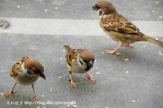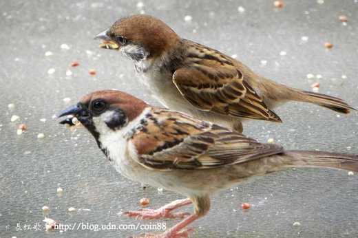 下圖二、麻雀媽媽陪小麻雀覓食,喉部的黑色、嘴角的黃色,可以區別老小。