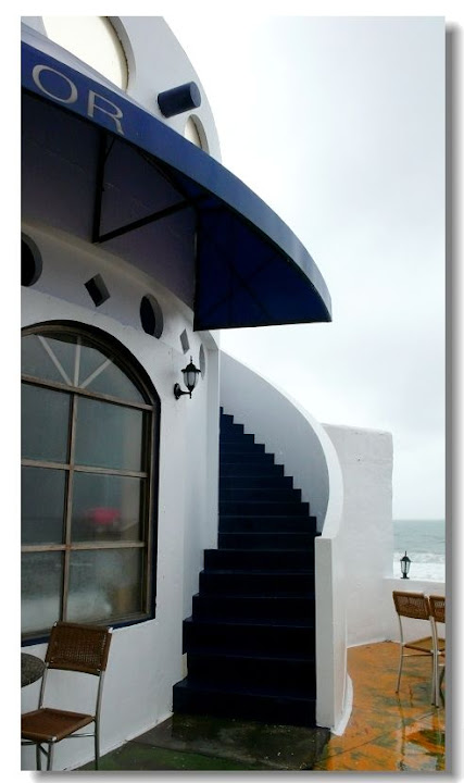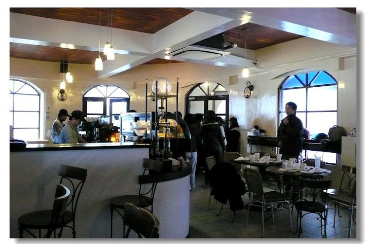 坐久了,小孩開始鬧脾氣,下雨又不能下車,此時剛好看到一棟頗為希臘式建築的咖啡屋.