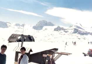 很顺利的在黑漆漆中進入我所計劃中要投宿的小鎮 St.Wolfgang 當時也不知道這個小鎮的來頭,可是第二天一早醒來,窗簾布一拉開,發現人已是身在雪山湖畔旁,湖水已無結冰,可是清晨水氣濛濛,又遠眺近在眼前的雪山,湖山連成一線,真是美的令人不敢相信的大驚喜,趕快叫醒還在呼呼大睡的兩位伙伴起來,用完餐後就沿著鄉間小徑,其間兩旁也蓋有瑞士木屋的小路,以及半山上的小村莊,而直奔上屬於阿爾卑斯山一環的雪山,由於4月此時冰雪尚未融化,也使我們體會到此次旅程中玩雪的另外一個驚喜!