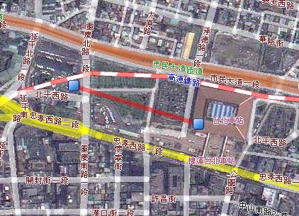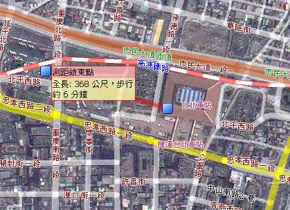 (圖檔一和圖檔二,台北火車站到國道客運總站光是直線距離就超過三百五十公尺!!就算直接穿過建築物和馬路走路也要六分鐘!!)