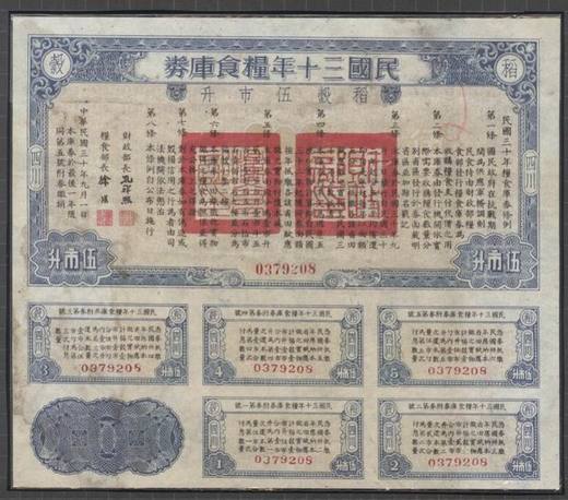 中国近代以来实行粮票制度最早其实是国民政府实行的。无疑,粮票制背后基本是基于配给制的经济学基础,而这个基础就是物质的普遍匮乏与政府宏观调控的必须。1937年7月,抗日战争爆发。南京、武汉相继沦陷后,国民政府移驻重庆,四川成为抗日的大后方。由此,城市人口急剧增加,粮食供应日趋紧张。1940年7月,蒋介石下达了“以后征粮,应以谷米为准,而不以货币为主”的手令。财政部于次年6月拟订了《战时田赋征收实物条例》,经行政院525次会议通过,于1941年(民国30年)7月颁发施行,并决定田赋征实时随征带购部分粮食,以解决抗战军需民食。粮食库券是国民政府田赋改征粮食、随征带购的凭证,其性质是政府向民间借粮,发给粮食库券作为借粮凭证,其还付的形式是以抵缴田赋来冲抵借粮。随征带购实质上是带有一定强制性的、政府向民间统购粮食的性质。如国民政府在征税(征粮食实物)的同时,统一向民间购买或借一定数量的粮食,征一购一,征一借一,是国民政府下达计划任务,各地政府执行完成。比如四川省政府成立了四川省田赋征粮实施办法委员会,提出了具体的征购方案,经国民政府财政部、粮食部两部核定,四川省1941年征购稻谷总额为1200万市石,征一借一,各600万市石。财政部规定,随征带借的稻谷价为每市石100元,30%付现金,70%发粮食库券。粮食库券由财政、粮食两部印制,分稻谷和小麦两类各分1、2、3市升,1、5市斗,1、3、10、100市石9种,委托中国农民银行和四川省银行代理发行,所发粮食库券从1943年起分5年抵缴田赋偿还。这个政策一方面对保证抗战军需,调节民食,稳定市场物价,安定抗日大后方,起了重大的作用;另一方面使得农民的利益被两次剥削而愈加贫困,挣扎在死亡线上。(有图有真象,图片是民国三十年的“粮票”。财政部长孔祥熙的大名在上呢)