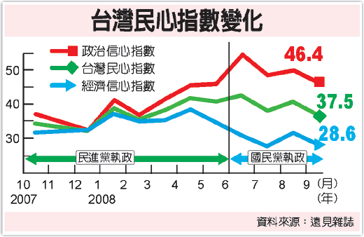 馬政府最近決策反覆,民眾對馬總統信心指數首度跌至負向評價區間。由本報與遠見雜誌共同舉辦的台灣民心指數調查顯示,9月台灣民心指數37.5;其中政治信心指數46.4、經濟信心指數28.6,分別較上月下跌3.5 點與3.3點。政治信心指數也是馬總統就任四個月以來最低點。