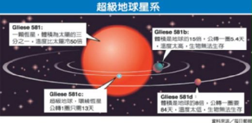歐洲天文學家宣布,在距離地球廿點五光年的太空中,發現了一個「超級地球」,氣候和地球類似,還有液態水和大氣,是人類在太陽系以外發現的第一個類似地球的行星,科學家已鎖定為尋找外星生物的重要目標。