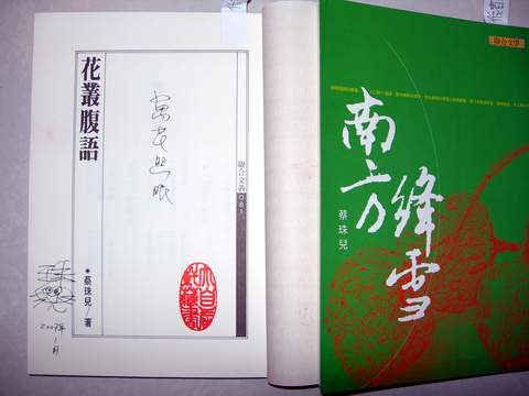 簽名過程中,她問我是否從事文化工作的(可見我的問題夠瞎,讓她對我印象深刻!),我連忙說我只是一個愛書的人而已,為了有話題可接續避免尷尬,情急之中,不得不把魚頭、小美兩位老大的名號抬出來,於是我接著說個人藏書過程中曾經接受魚頭老大、王小美老大不少指導(真不好意思,完全是為了製造良好氣氛,並非往自已臉上貼金阿),她一聽到這兩位老大名字就很高興地說:「阿,他們都是我的好朋友!王小美還去過我家拍照!」我也邀請蔡小姐如果上網也不妨到本格大自在軒逛逛。