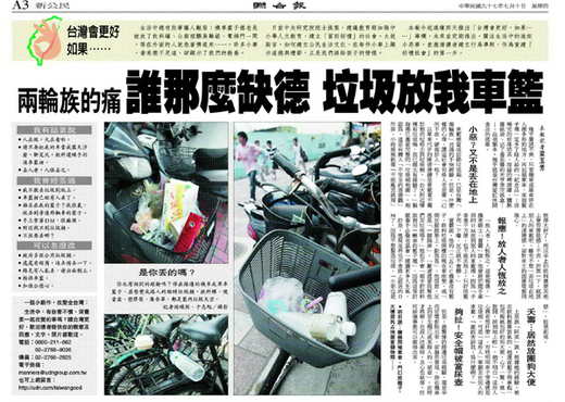 車籃被當成活動垃圾箱,已是台灣「兩輪族」共通的不快經驗。但是,什麼樣的心理,讓這社會有些人老是要「己所不欲,硬施於人」呢?