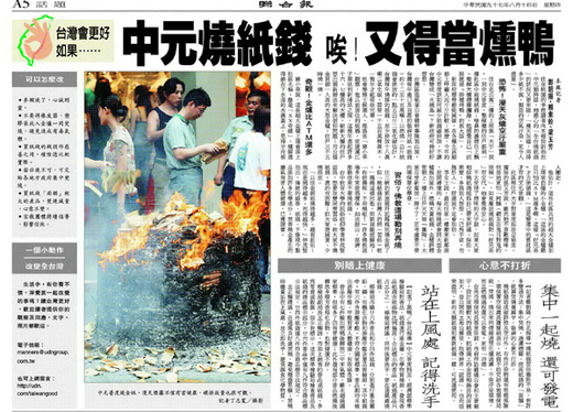 住台北公寓二樓的上班族「大宇」說,一到中元普度,整棟樓的住戶都到一樓社區中庭燒紙錢;嗆鼻的濃煙往上飄,整棟大樓煙霧瀰漫,他感覺自己「活脫就是『掛爐烤鴨』的放大版」。