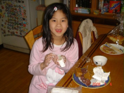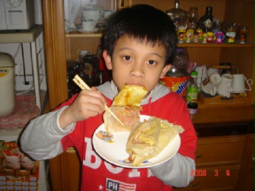 大支的仍然教他做蛋餅,小支的就教他用餛飩皮包年糕。