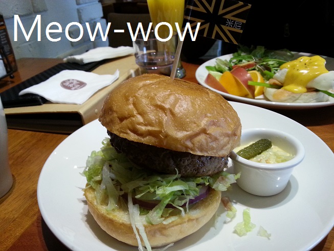 漢堡牛肉可以選擇熟度,MEOW選七分熟,吃的到鮮甜的肉汁,肉的口感熟嫩交織,彼此融合。麵包越嚼越香,酸黃瓜生菜,洋蔥,番茄,芥末醬,可以中和牛肉油脂。