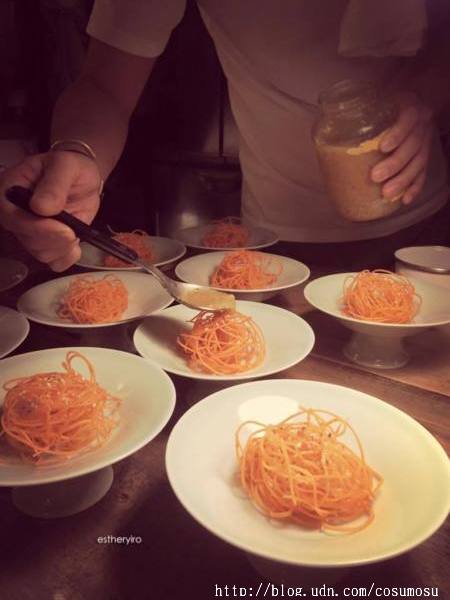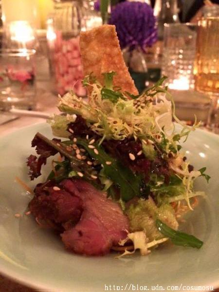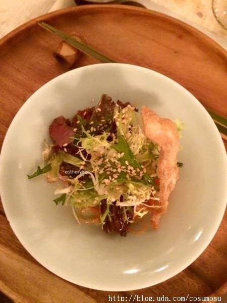 烤三層肉、紅蘿蔔絲、芝麻菜佐蜂蜜薑汁搭配炸餛飩皮