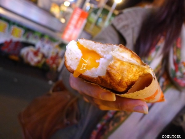 這攤「爆蛋糕」也很特別,裡面是包了生雞蛋的雞蛋糕。
