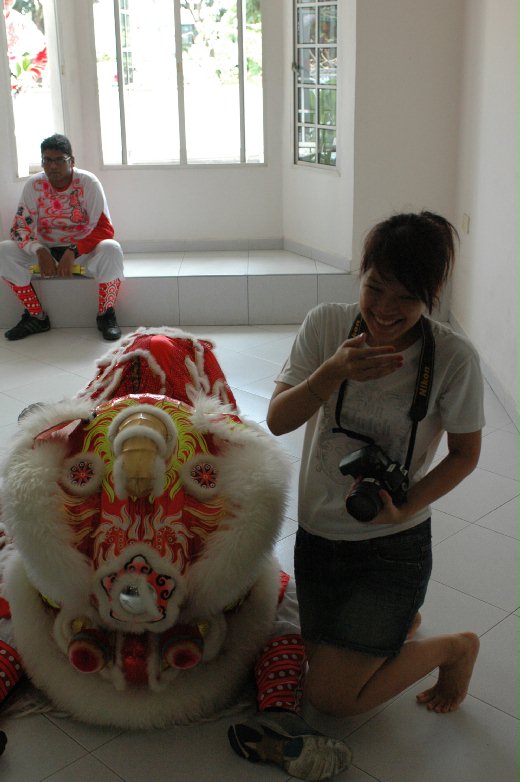 原來,在新加坡連舞獅都可以叫外送。大家庭都會在過年時請舞獅來討個吉祥也熱鬧一下。在室內敲鑼打鼓可說是相當壯觀。我們也因為「客人」的特別身份,有幸與舞獅玩玩遊戲,沾沾喜氣。