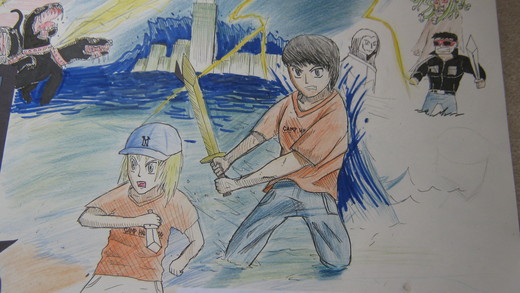 這張海報拍攝時,還沒有完成.兒子大概花了兩個星期構思完成.裡面的圖畫全是他依照故事情節想像畫出來的.這一點,當媽媽的想幫也幫不了,只能在旁邊欣賞(這不就是最大享受?)當他完成時,我說:"我覺得你這張海報太花了...書名的標題不是很明顯.."