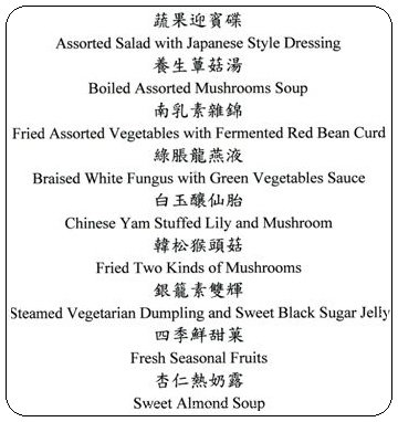 台北京站是我第一次前往,周遭環境改善許多,而君品17樓頤宮是一中餐廳,我用「素食」(菜單如下)。