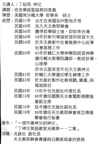 2010年12月14日中午12時30分,台北忠誠扶輪社舉行例會,上週本社找馬神父演講,而今日則找丁松筠神父演講「從音樂談聖誕節的意義」。