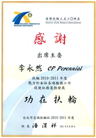 2011年7月5日中午,忠誠扶輪社假圓山飯店舉行第12、13屆社長‧職委員交接典禮暨三重三陽扶輪社聯合例會。