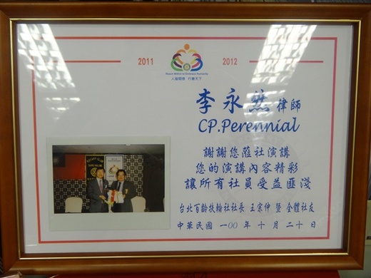 2011年10月20日,我應百齡扶輪社之邀,在該社例會時前往演講,主題是「參與都市更新的法律須知」。