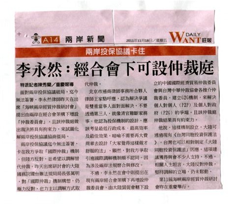 我親自出席參與,會中我針對「兩岸投資保障協議」如何簽訂,提出個人的看法並企盼中國大陸能接受「P to G」的部分能採用「仲裁」,而不要僅透過「強制調解」,這樣方更有助於兩岸經貿交流的良性發展!