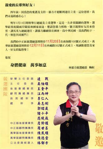 林郁方教授是我的友人,多年來擔任立委的工作,今年再度爭取連任。