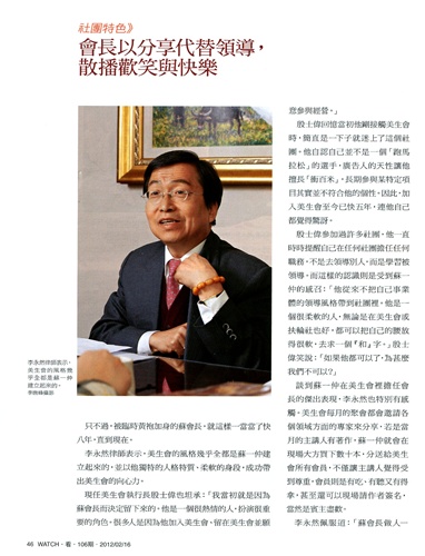 2012年2月中出刊的第106期《看》雜誌,以和泰興業董事長蘇一仲為封面人物,並報導他的故事。我因為與蘇董是好友,並同在美生會,便接受該雜誌採訪,暢談了我所認識的蘇一仲。